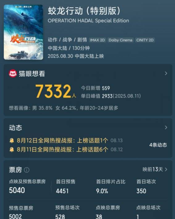 删减16分钟,《蛟龙行动》重映不雅众也不买账?预售票房仅5040元!