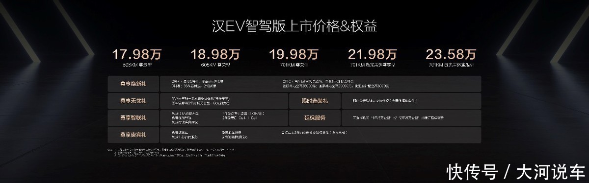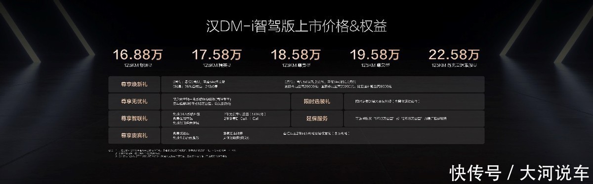 其中,汉DM-i智驾版共推出5款车型,售价16.88万~22.58万元;汉EV智驾版共推出5款车型,售价17.98万~23.58万元,首创B+C级轿车全民智驾,加配不涨价!