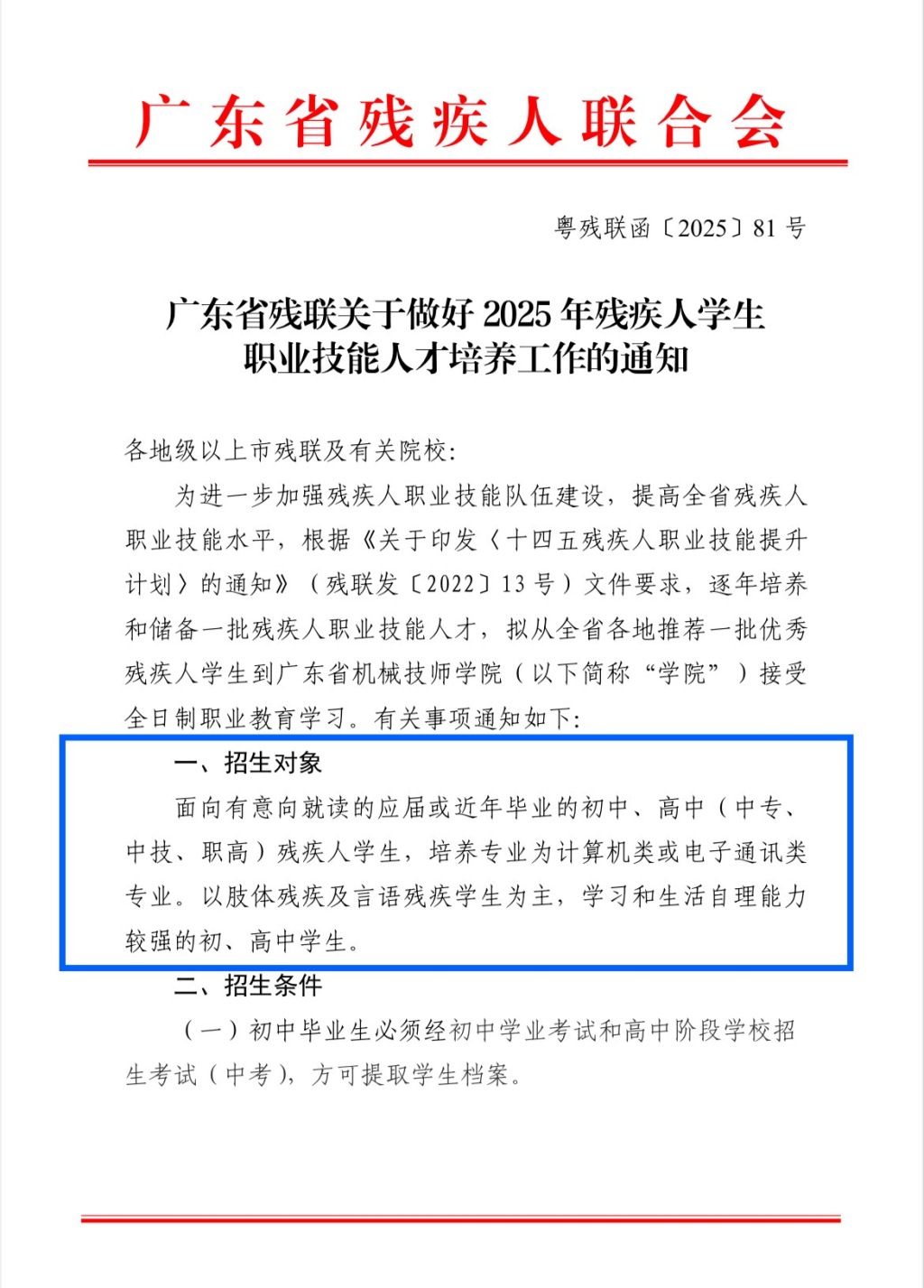 《广东省残联对于作念好2025年残疾东谈主学生功绩本事东谈主才培养责任的奉告》。图片开首:截图