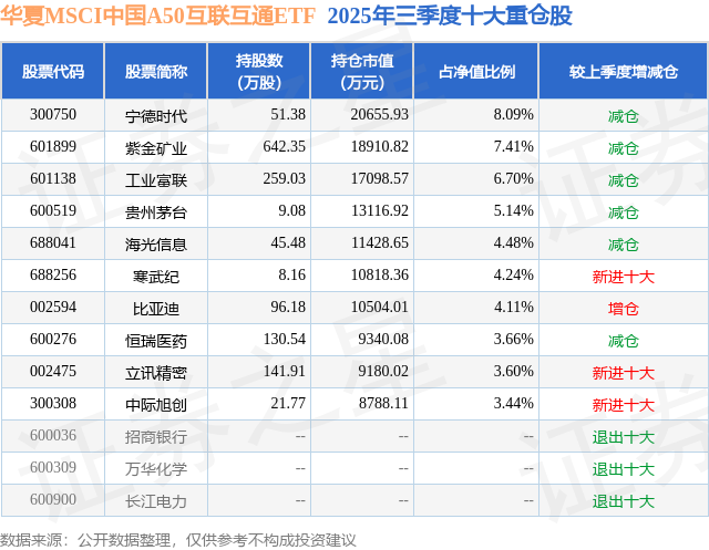 从基金鸿沟来看,中原MSCI中国A50互联互通ETF基金2025年三季度公布的基金鸿沟为25.53亿元,较上一期鸿沟31.01亿元变化了-5.48亿元,环比变化了-17.67%。该基金最新一期财富成立为:股票占净值比99.07%,无债券类财富,现款占净值比0.93%。从基金捏仓来看,该基金当季前十大股票仓位达50.87%,第一大重仓股为宁德时期(300750),捏仓占比为8.09%。