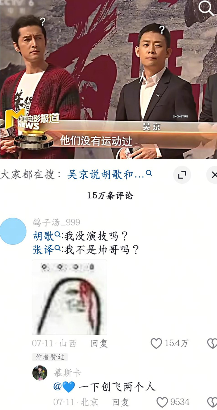 胡歌和张译站一块儿,吴京这个夸法听着像损东说念主,真谛胡歌没演技,张译没颜值,一下创飞了两个东说念主。