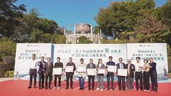 台海网12月11日讯(记者 查小丽/文 王宇翔/图) 12月9日下昼,第14届海峡两岸茶文化季暨26季两岸茶王擂台赛受奖典礼在厦门翔安香山举行。古有“金厦同吟”竖立“海峡诗路”,今有千年文脉再会两岸茶缘,奏响两岸茶产业调和发展的时期新章。