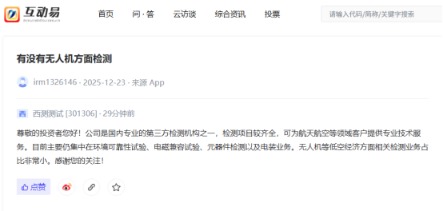 上证报中国证券网讯西测测试20日在互动平台回复投资者发问时暗示,公司是国内专科的第三方检测机构之一,检测面貌较皆全开云体育,可为航天航空等边界客户提供专科本领奇迹。现在主要仍网络在环境可靠性熟悉、电磁兼容熟悉、元器件检测以及电装业务。无东说念主机等低空经济方面关系检测业务占比很是小。