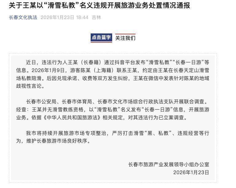 1月23日体育游戏app平台,长春市文化市集概述行政法则支队发布《对于王某以“滑雪私教”模式违章开展旅游业务不停情况通报》。